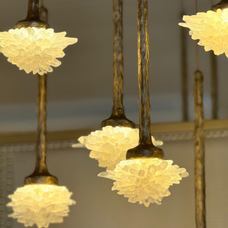 A serie de luminárias Artêmis tem como característica sua iluminação pontual em forma de estrela. Em estruturas diversas que evocam linhas inspiradas nos trabalhos dos mestres artesões ourives, conta com uma textura também inspirada em elementos naturais, como rochas vulcânicas e corais marinhos.