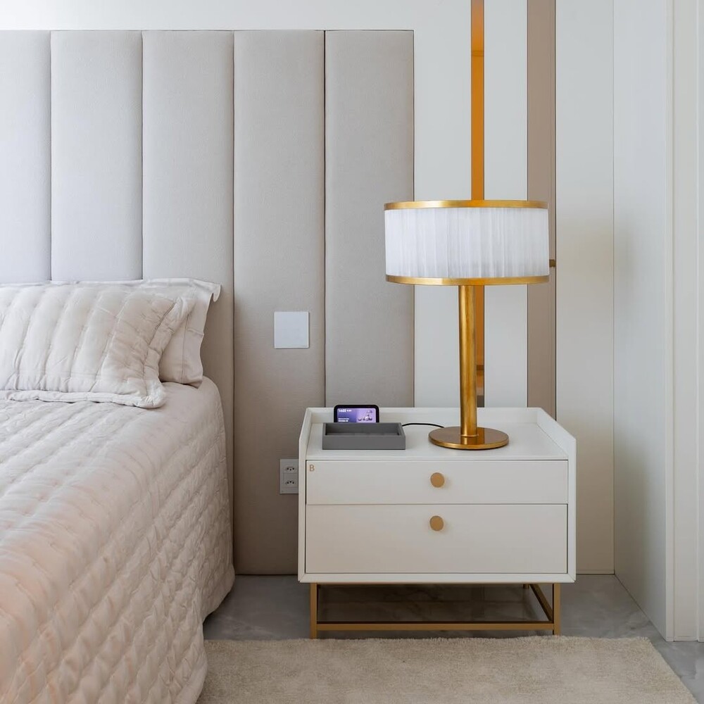 Abajur com corpo em metal e cúpula cilíndrica revestida em selenita.