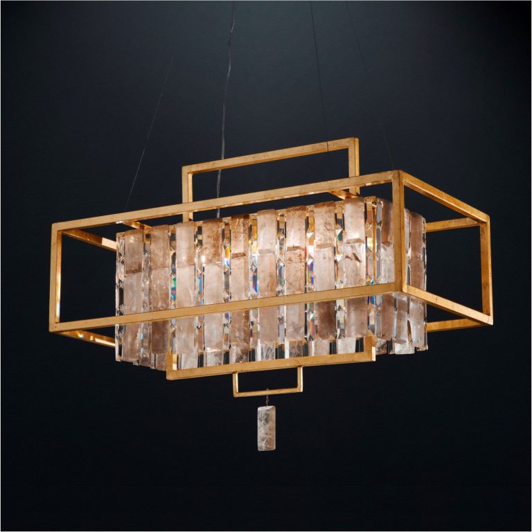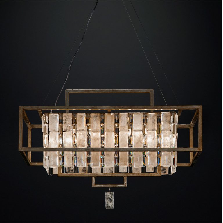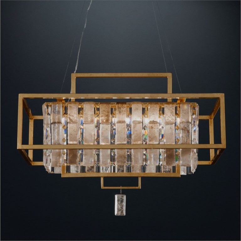 Pendente de estética geométrica, composto por placas retangulares de cristal de rocha natural e cristal lapidado. Inspirado na elegância atemporal do movimento Art Déco, o design explora simetria, brilho e sofisticação em uma composição escultural.