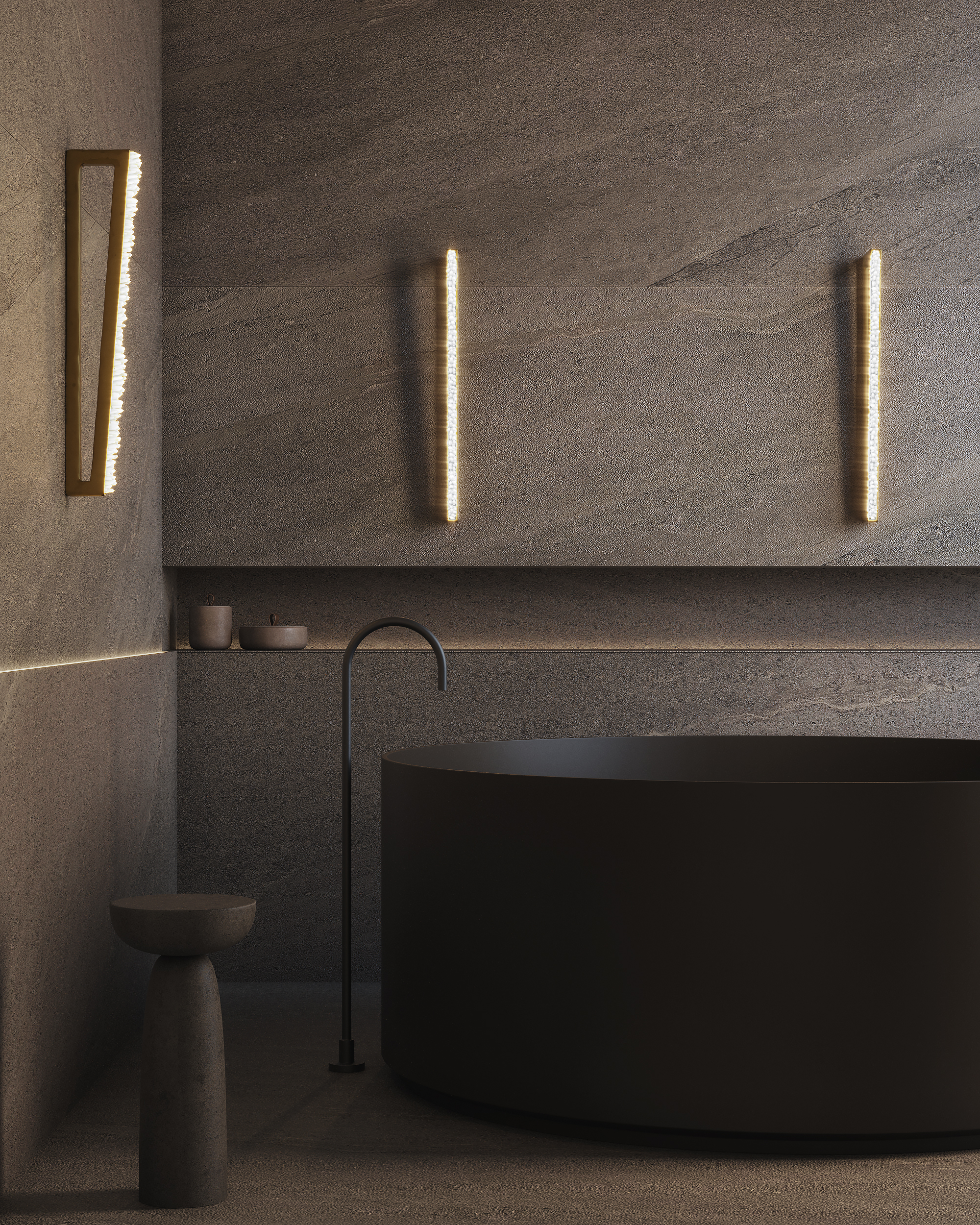 A série de luminárias Thebes nasceu inspirada na mitologia grega de Cadmus, fundador da cidade de Tebas. O design geométrico é minimalista no design mas maximalista no efeito, ressignificando o conceito do tradicional lustre deslocando a fonte de luz do interior para suas extremidades que possuem centenas de pontas de quartzo que emitem uma luz quente e acolhedora. Os conceitos da arquitetura clássica grega são características marcantes dessa coleção como a racionalidade, ordem, beleza e geometria.